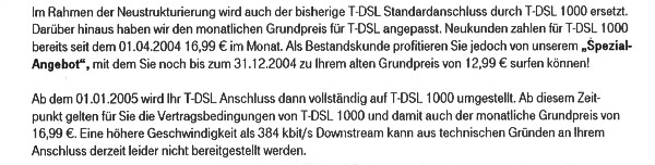 Auszug aus einem Schreiben der Deutschen Telekom von April 2004 (Original vorliegend):
